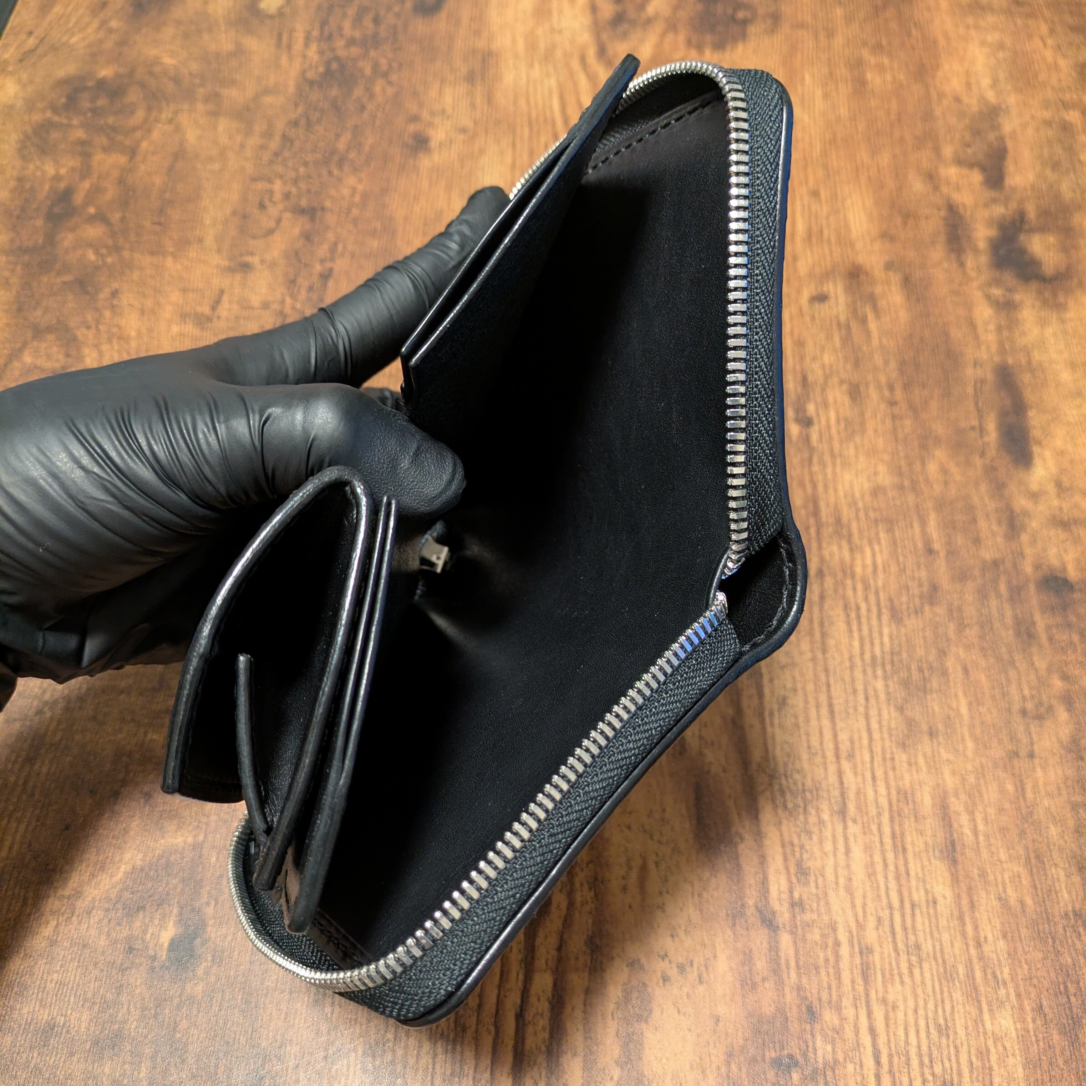 希少なポロサスをセンターで型取り、バックポケットにもボディバッグにも収まりの良いラウンドファスナーウォレット。